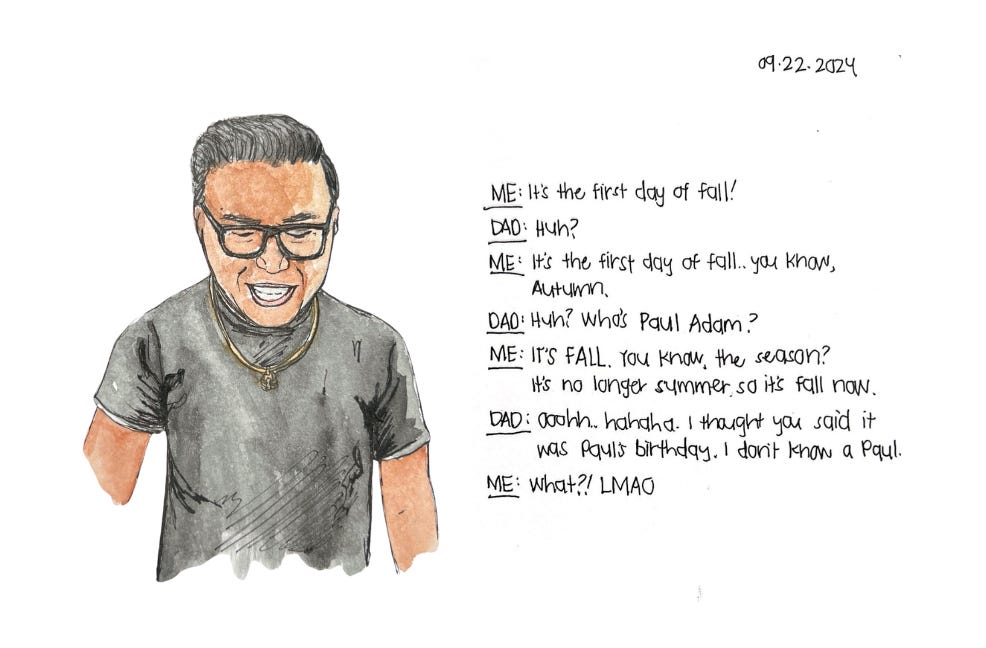This past Sunday, the first day of Autumn Equinox, I had a funny conversation with my Dad. It made my day so much brighter I had to illustrate it.