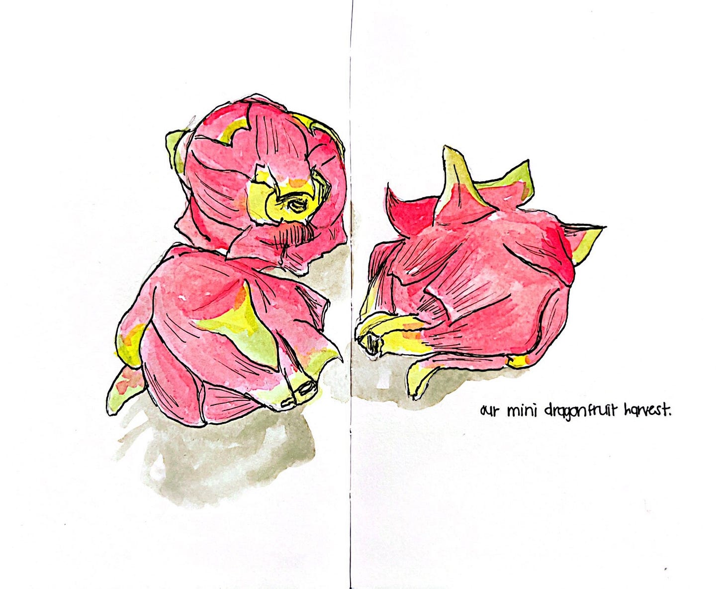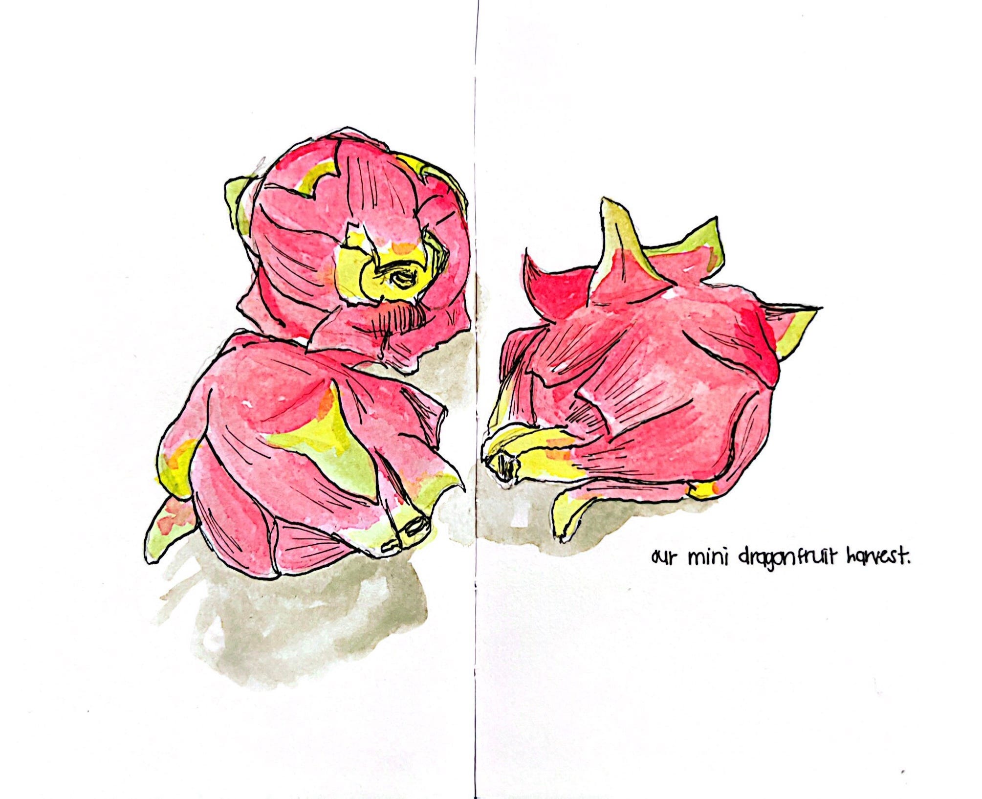 Aside from that, here’s my annual dragonfruit harvest drawing. This year’s harvest wasn’t very abundant like the previous years (30+ dragonfruit), but I’m grateful we have some growing. The first one we harvested a week ago was large and so delicious! But, look at this cute trio below: